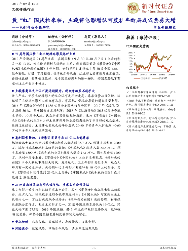 【新时代证券】【20190915】最“红”国庆档来临,主旋律电影增认可度扩年龄层或促票房大增-9页