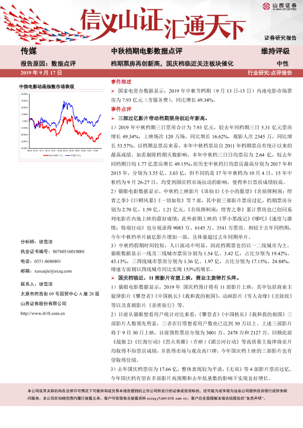 【山西证券】【20190917】20190917-山西证券-中秋档期电影数据点评:档期票房再创新高,国庆档临近关注板块催化-4页