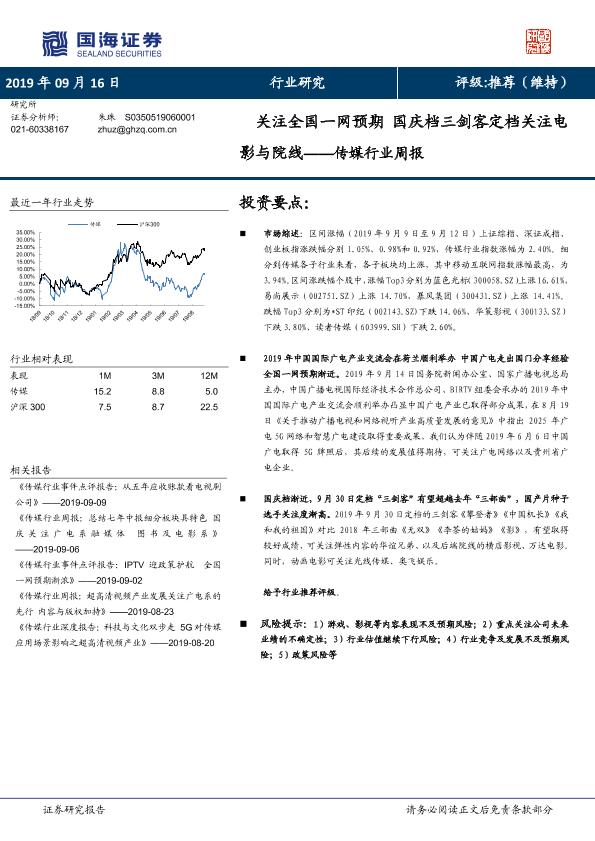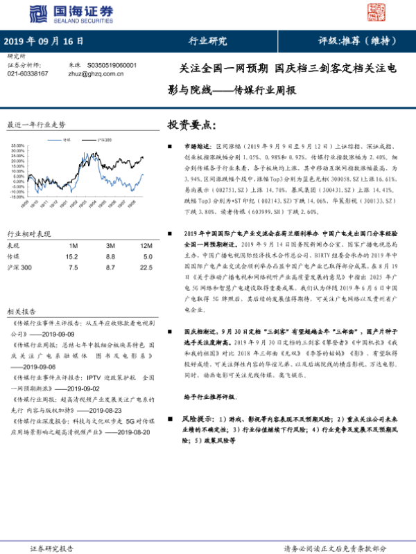 【国海证券】【20190916】传媒行业周报:关注全国一网预期 国庆档三剑客定档关注电影与院线-19页
