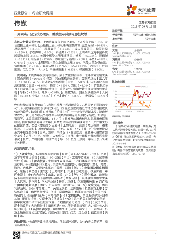 【天风证券】【20190915】传媒一周观点:坚定核心龙头,继续提示滞涨电影板块等-25页