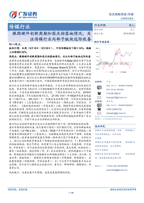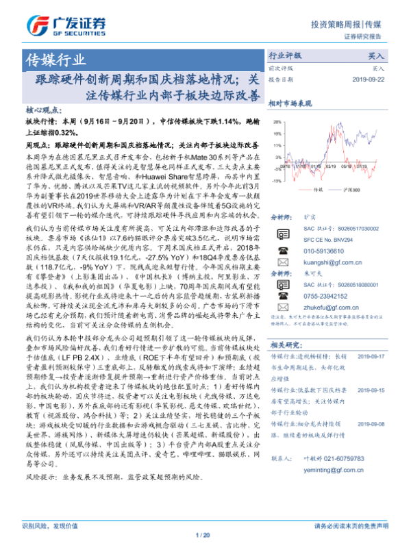 【广发证券】【20190922】20190922-广发证券-传媒行业投资策略周报:跟踪硬件创新周期和国庆档落地情况;关注传媒行业内部子板块边际改善-20页