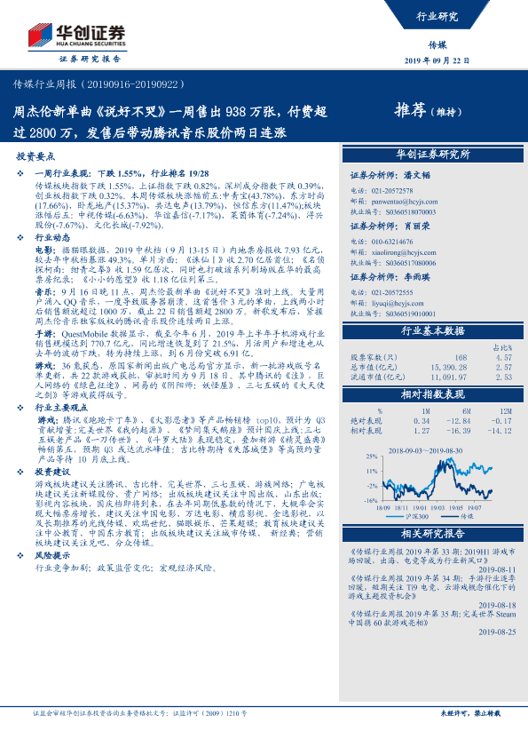 【华创证券】【20190922】20190922-华创证券-传媒行业周报:周杰伦新单曲《说好不哭》一周售出938万张,付费超过2800万,发售后带动腾讯音乐股价两日连涨-14页