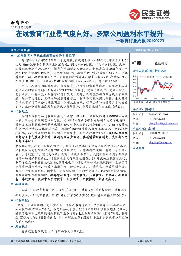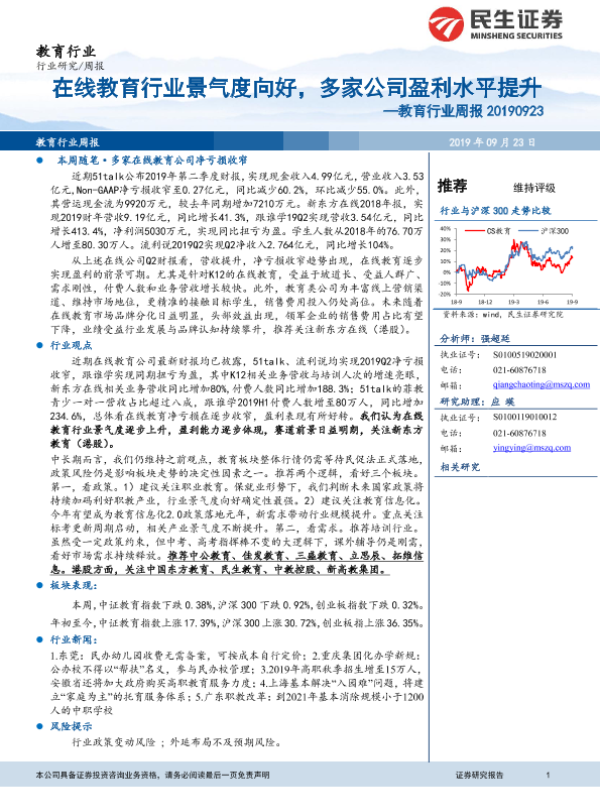 【民生证券】【20190923】教育行业周报:在线教育行业景气度向好,多家公司盈利水平提升-11页