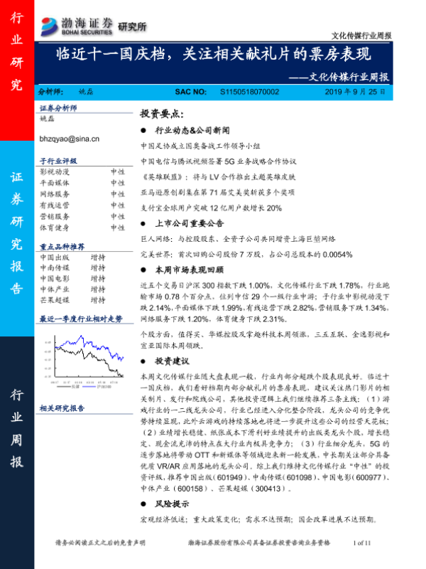 【渤海证券】【20190925】临近十一国庆档,关注相关献礼片的票房表现-11页