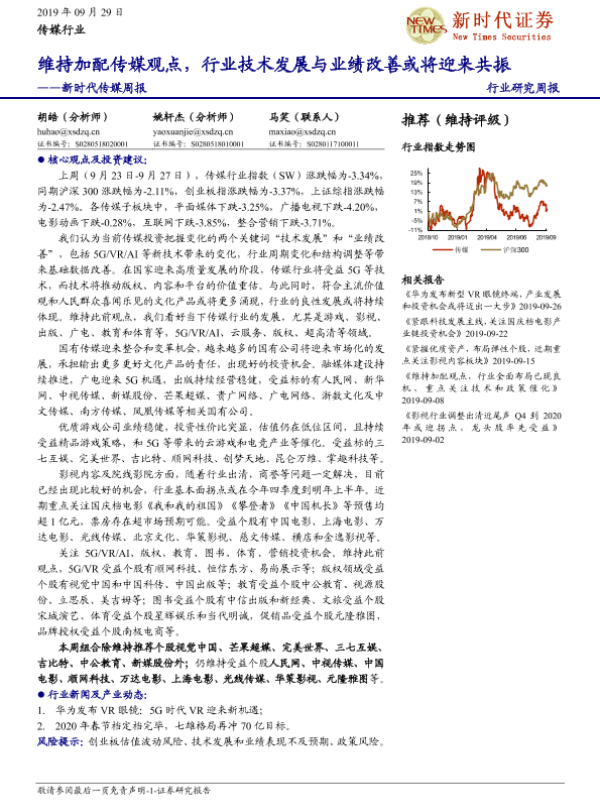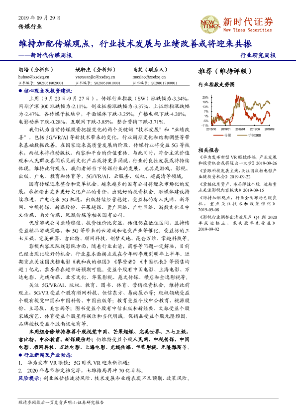 【新时代证券】【20190929】新时代传媒周报:维持加配传媒观点,行业技术发展与业绩改善或将迎来共振-14页