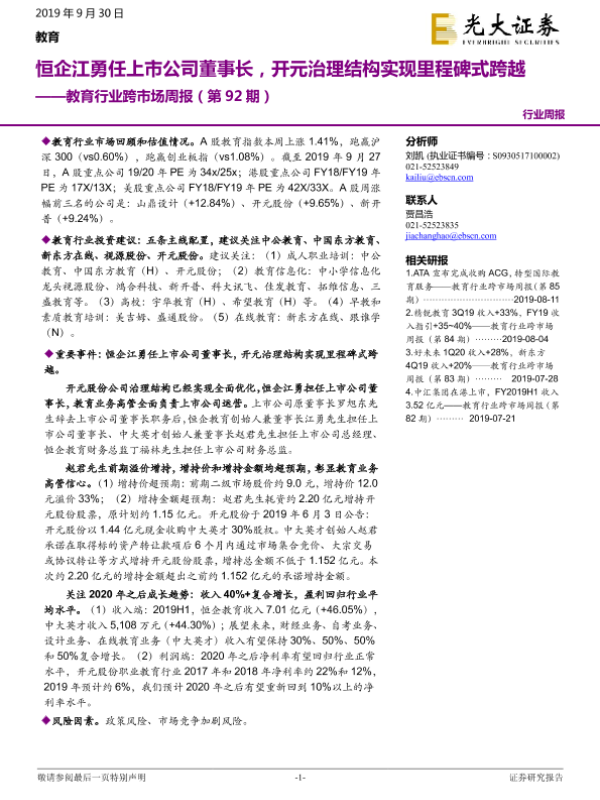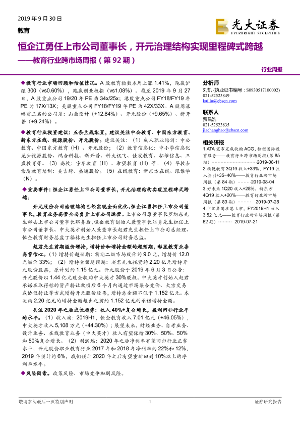 【光大证券】【20190930】教育行业跨市场周报(第92期):恒企江勇任上市公司董事长,开元治理结构实现里程碑式跨越-18页