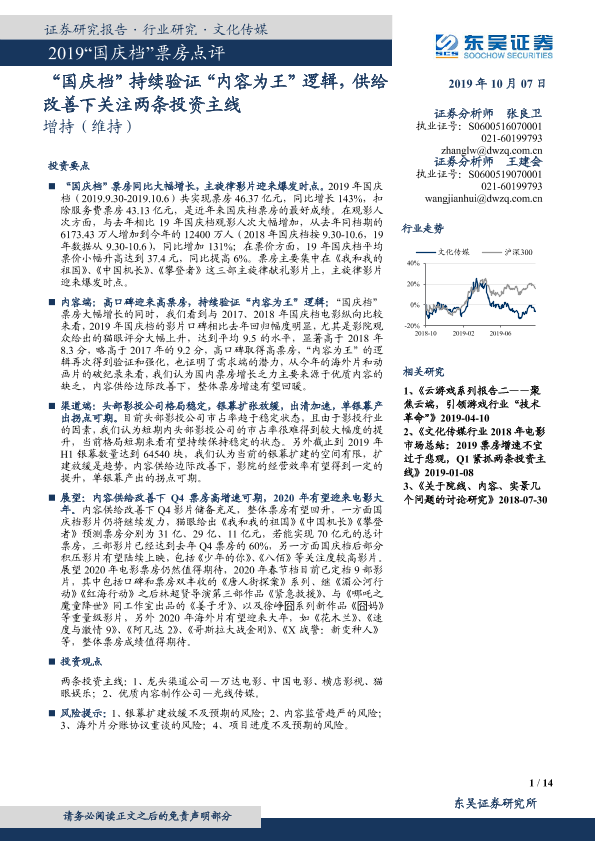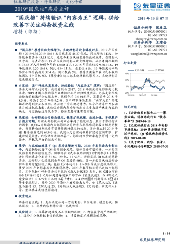 【东吴证券】【20191007】2019“国庆档”票房点评:‘国庆档’持续验证‘内容为王’逻辑,供给改善下关注两条投资主线-14页