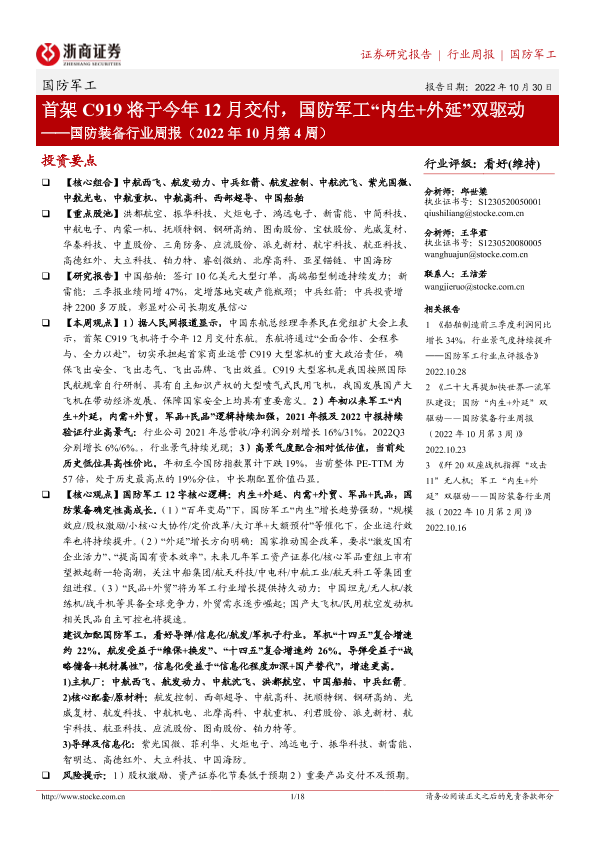 【浙商证券】【20221030】国防装备行业周报(2022年10月第4周):首架C919将于今年12月交付,国防军工“内生+外延”双驱动-18页