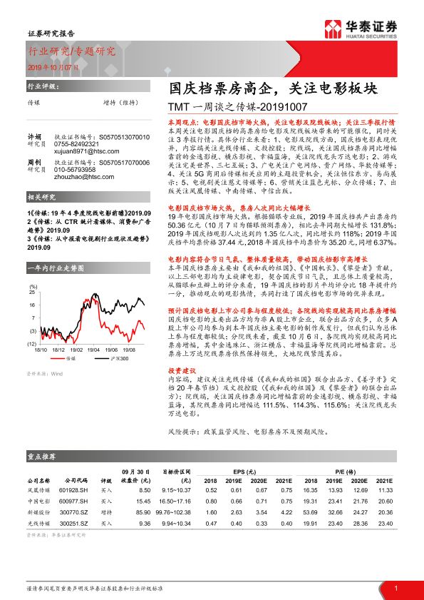 【华泰证券】【20191007】20191007-华泰证券-TMT一周谈之传媒:国庆档票房高企,关注电影板块-13页