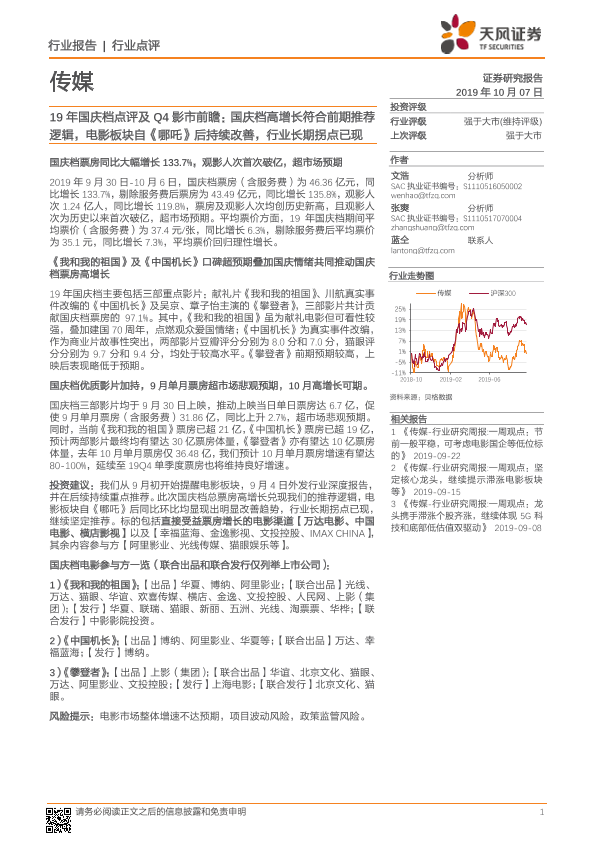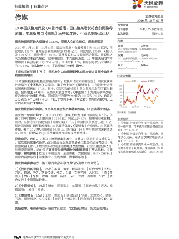 【天风证券】【20191007】19年国庆档点评及Q4影市前瞻:国庆档高增长符合前期推荐逻辑,电影板块自《哪吒》后持续改善,行业长期拐点已现-16页