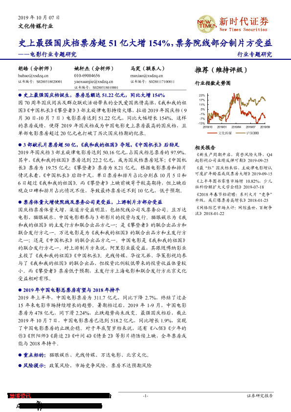 【新时代证券】【20191007】20191007-新时代证券-电影行业专题研究:史上最强国庆档票房超51亿大增154%,票务院线部分制片方受益-8页