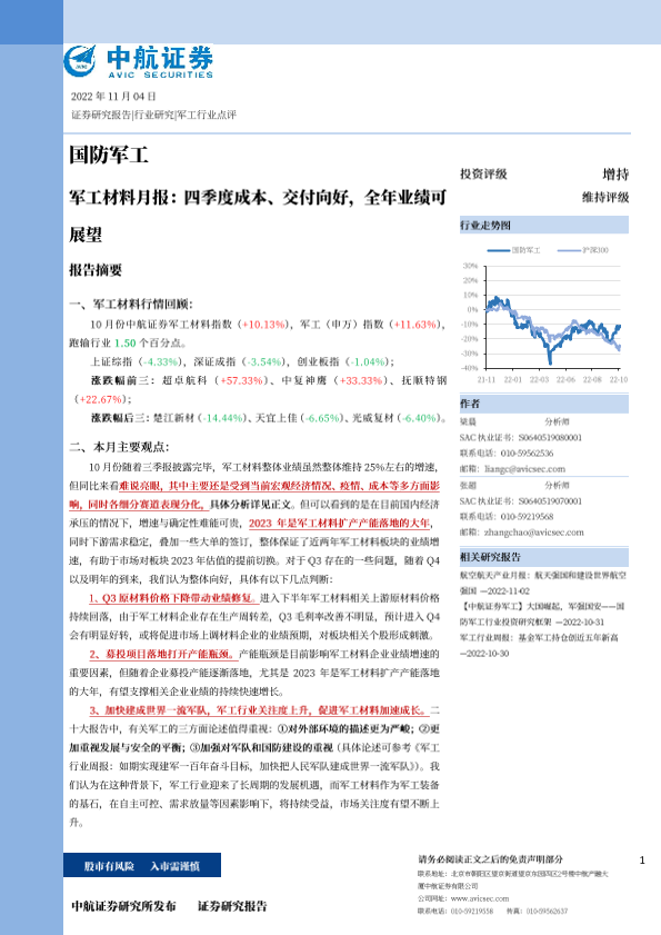 【中航证券】【20221104】国防军工行业军工材料月报:四季度成本、交付向好,全年业绩可展望-20页
