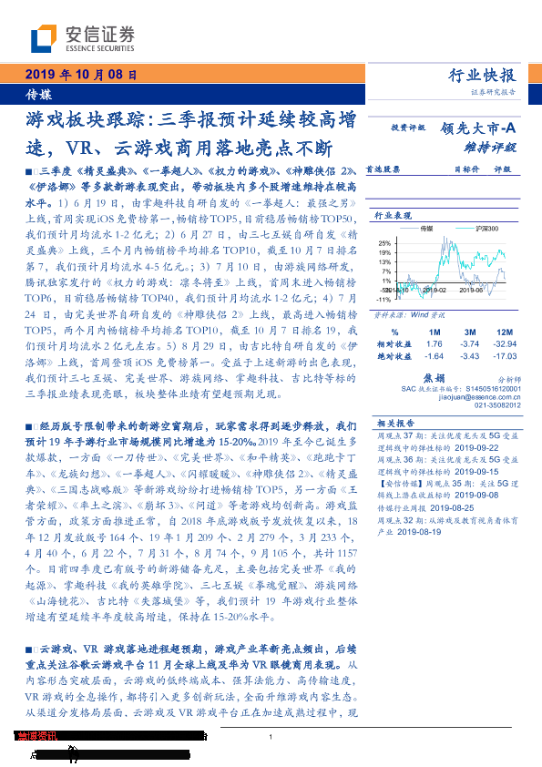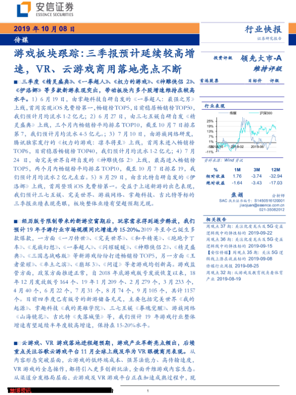 【安信证券】【20191008】游戏板块跟踪:三季报预计延续较高增速,VR、云游戏商用落地亮点不断-4页