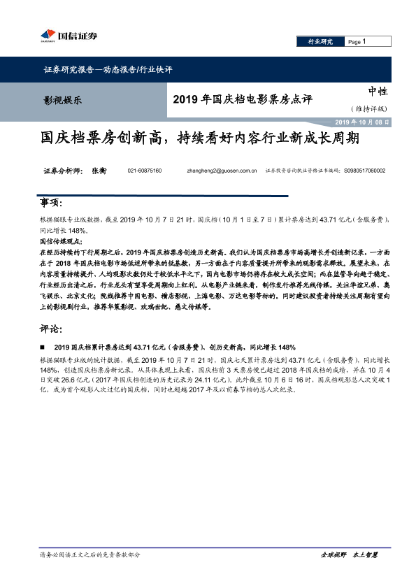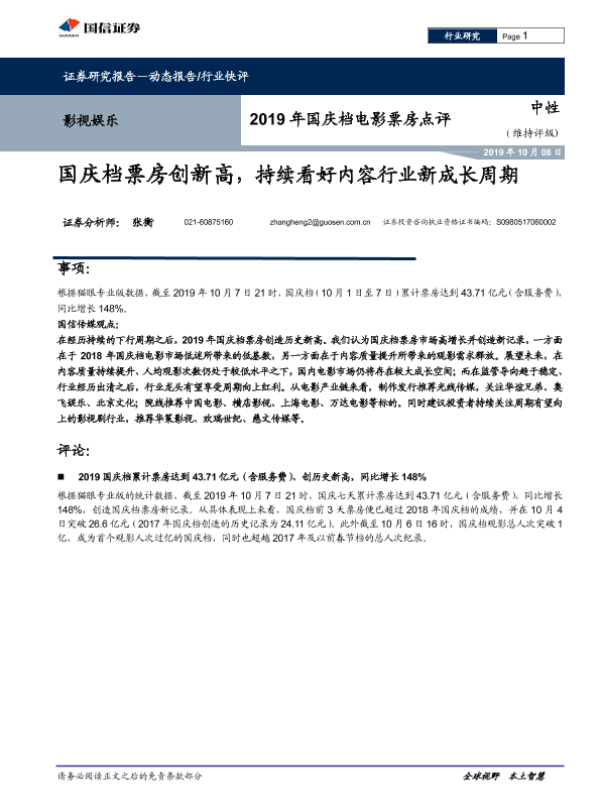 【国信证券】【20191008】2019年国庆档电影票房点评:国庆档票房创新高,持续看好内容行业新成长周期-7页