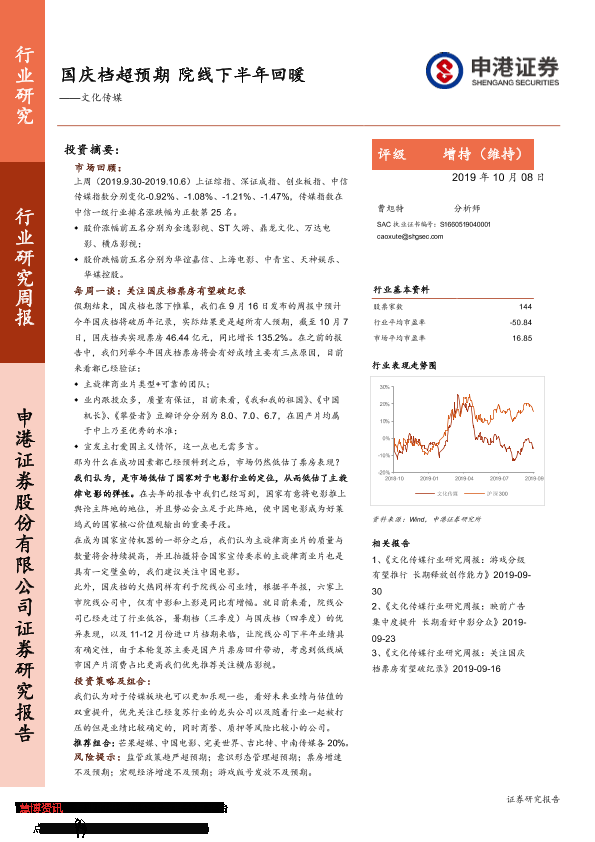 【申港证券】【20191008】20191008-申港证券-文化传媒行业研究周报:国庆档超预期 院线下半年回暖-17页