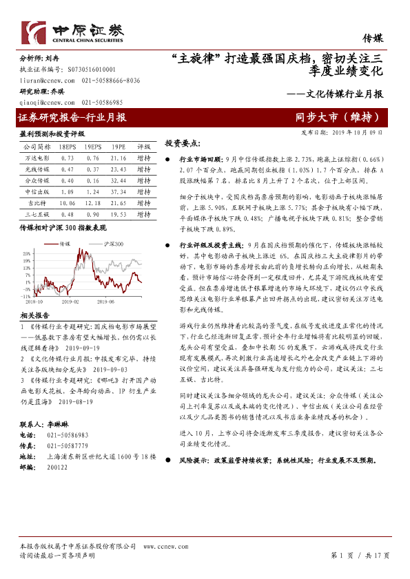 【中原证券】【20191009】“主旋律”打造最强国庆档,密切关注三季度业绩变化-17页