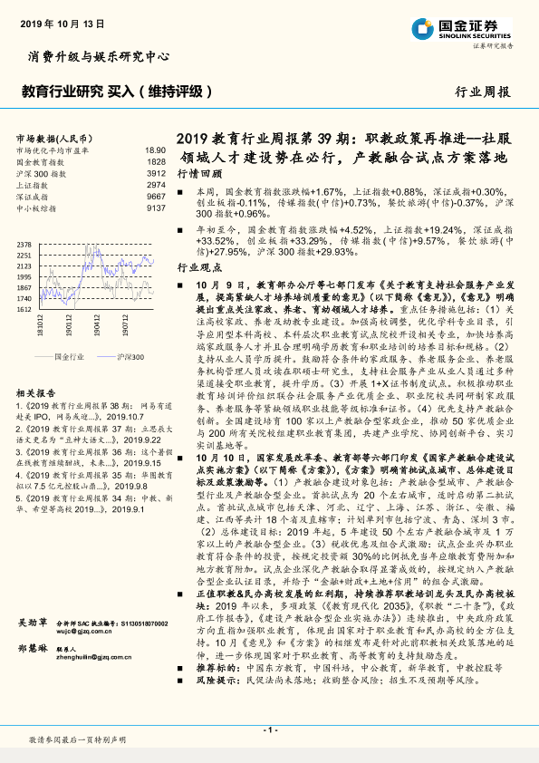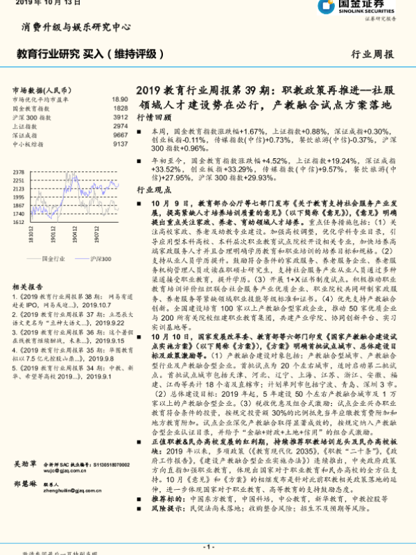 【国金证券】【20191013】2019教育行业周报第39期:职教政策再推进--社服领域人才建设势在必行,产教融合试点方案落地-8页