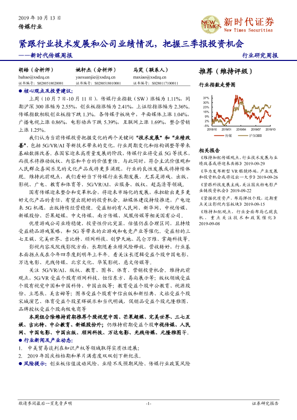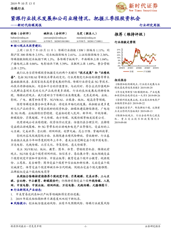【新时代证券】【20191013】新时代传媒周报:紧跟行业技术发展和公司业绩情况,把握三季报投资机会-13页