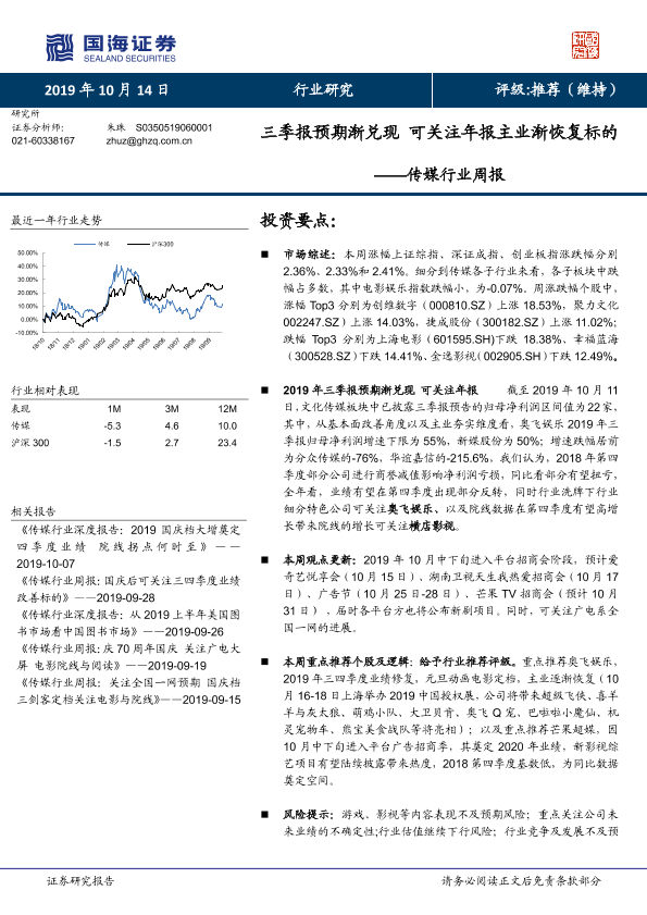 【国海证券】【20191014】20191014-国海证券-传媒行业周报:三季报预期渐兑现 可关注年报主业渐恢复标的-17页