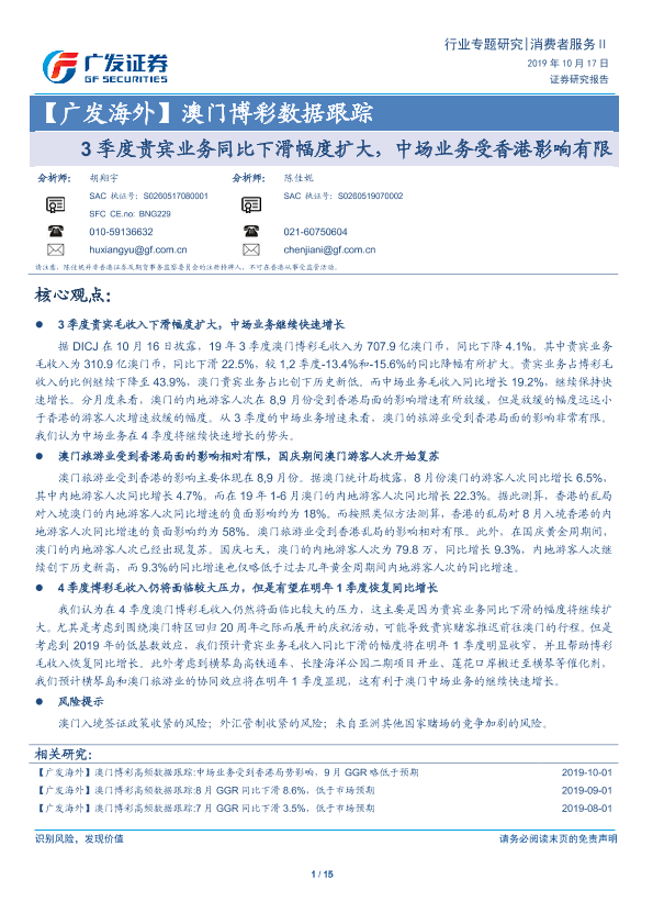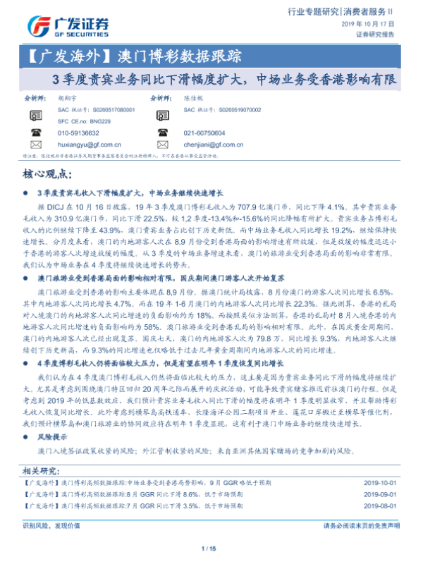 【广发证券】【20191017】澳门博彩数据跟踪:3季度贵宾业务同比下滑幅度扩大,中场业务受香港影响有限-15页