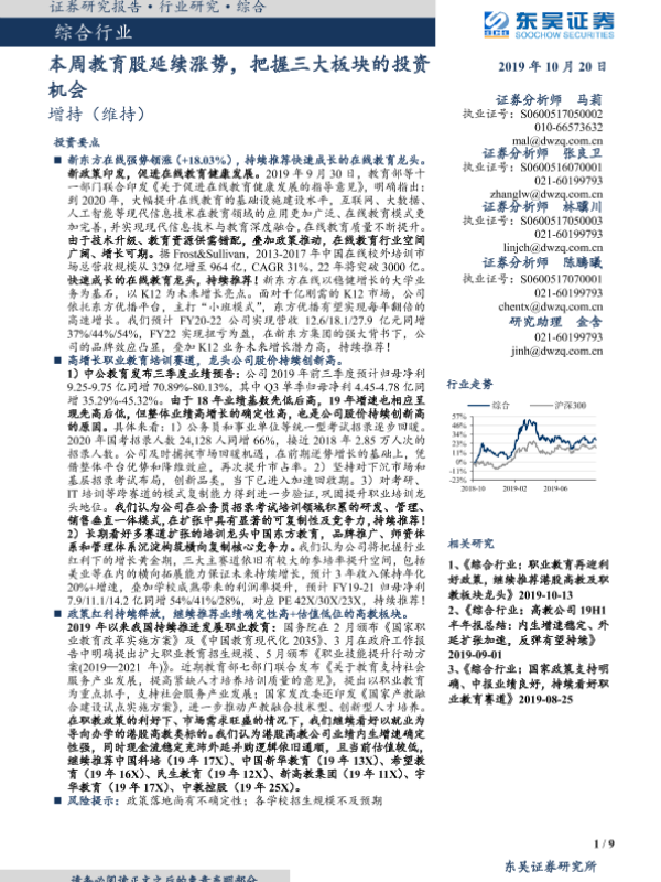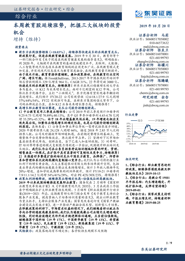 【东吴证券】【20191020】本周教育股延续涨势,把握三大板块的投资机会-9页