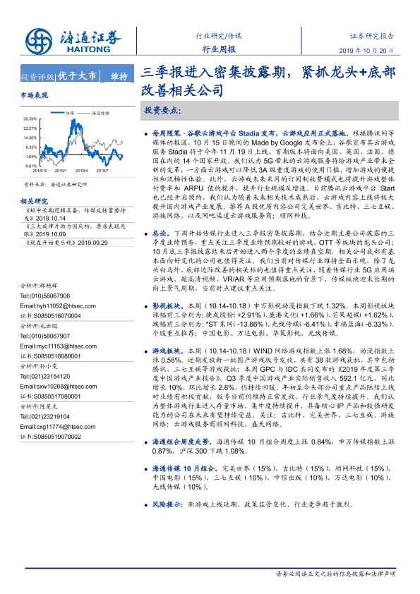 【海通证券】【20191020】20191020-海通证券-传媒行业周报:三季报进入密集披露期,紧抓龙头+底部改善相关公司-10页