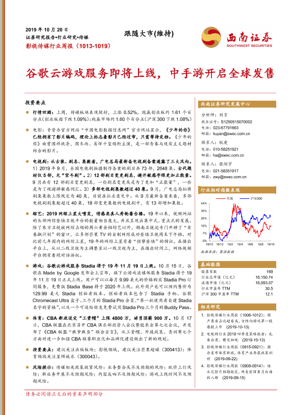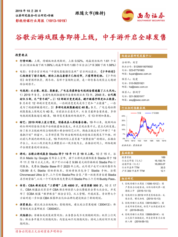 【西南证券】【20191020】影视传媒行业周报:谷歌云游戏服务即将上线,中手游开启全球发售-16页