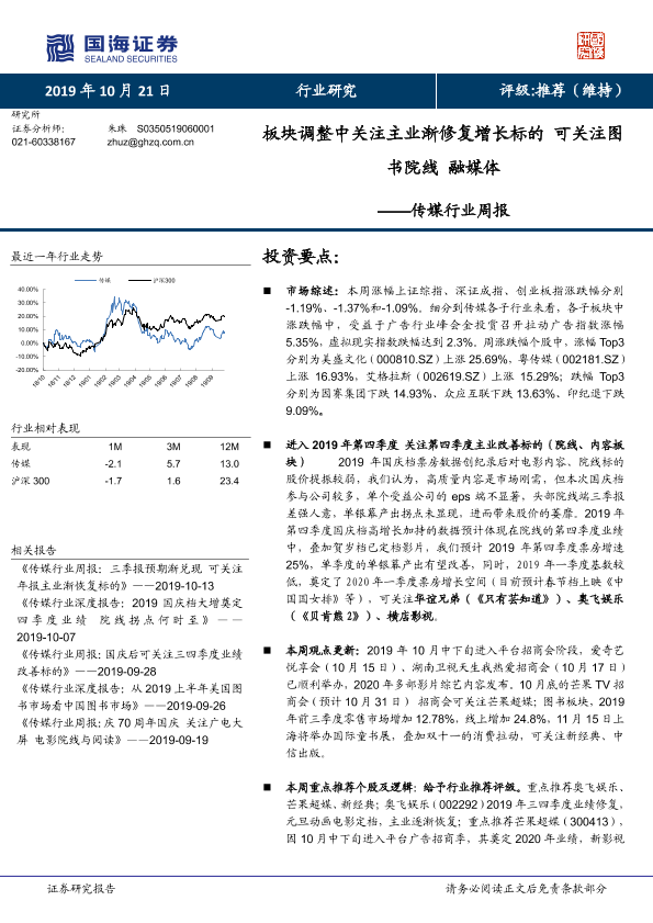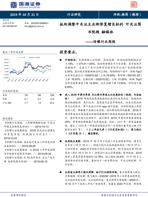 【国海证券】【20191021】传媒行业周报:板块调整中关注主业渐修复增长标的 可关注图书院线 融媒体-16页