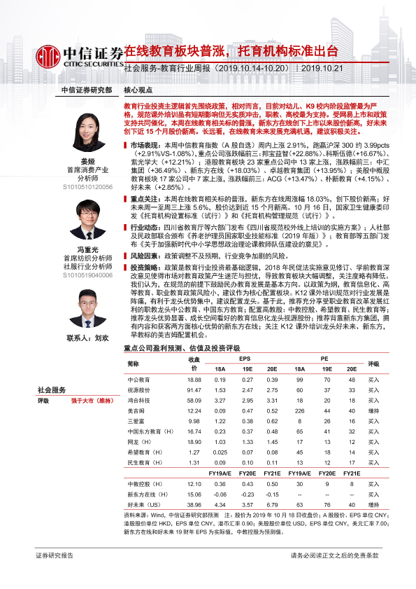 【中信证券】【20191021】社会服务-教育行业周报:在线教育板块普涨,托育机构标准出台-10页