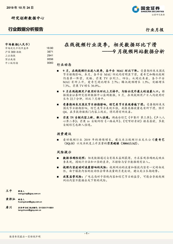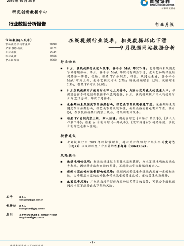 【国金证券】【20191024】9月视频网站数据分析:在线视频行业淡季,相关数据环比下滑-15页