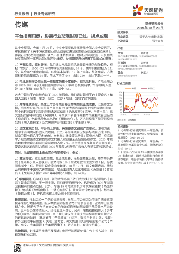 【天风证券】【20191023】传媒行业专题研究:平台招商洞悉:影视行业悲观时期已过,拐点或现-15页