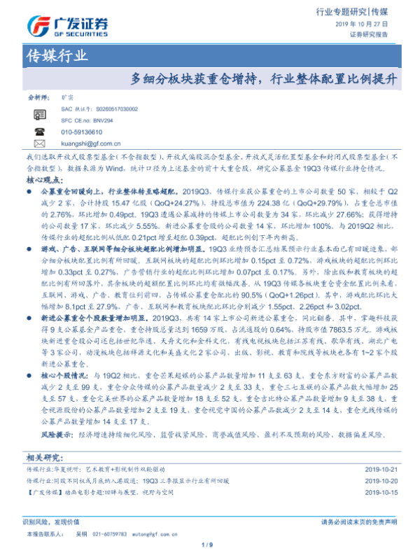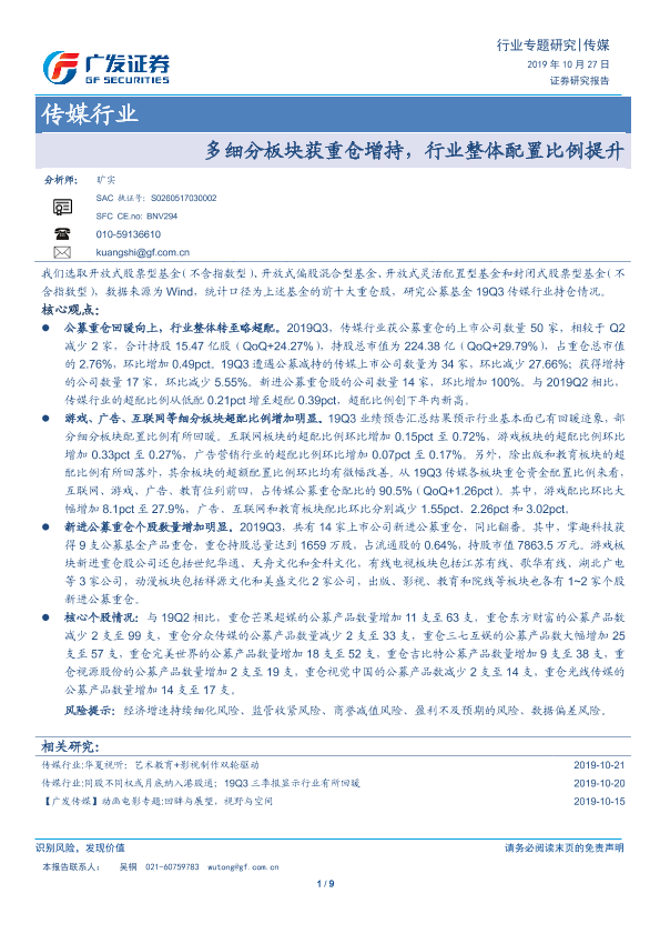 【广发证券】【20191027】多细分板块获重仓增持,行业整体配置比例提升-9页