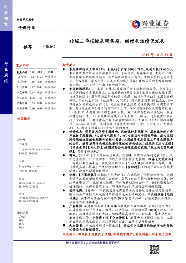 【兴业证券】【20191027】传媒三季报迎来密集期,继续关注绩优龙头-16页