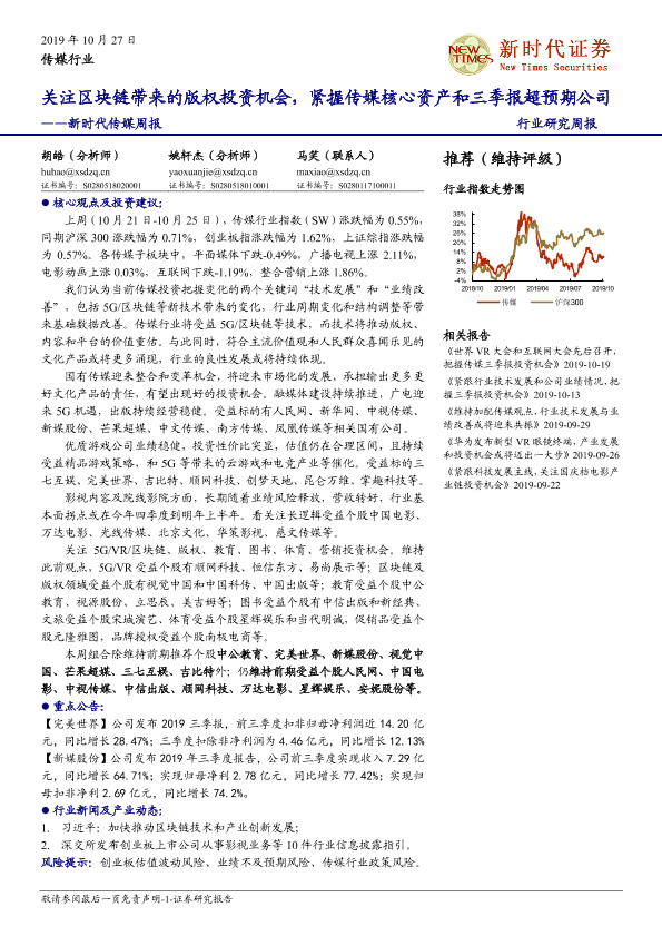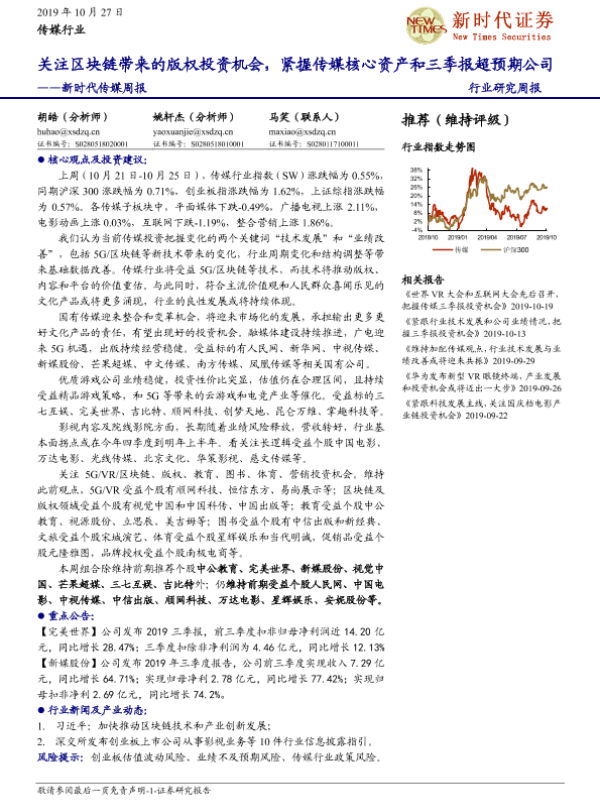 【新时代证券】【20191027】新时代传媒周报:关注区块链带来的版权投资机会,紧握传媒核心资产和三季报超预期公司-15页