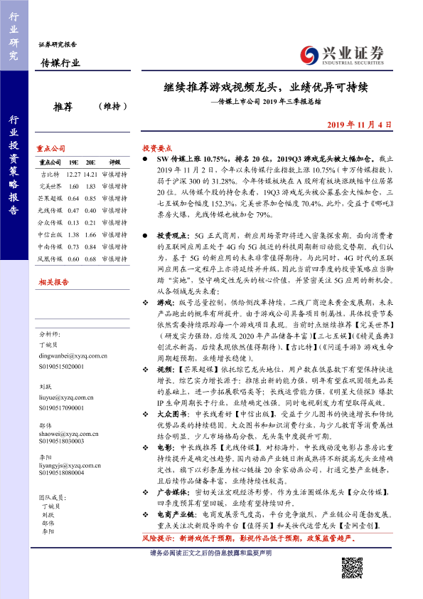 【兴业证券】【20191104】继续推荐游戏视频龙头,业绩优异可持续—传媒上市公司2019年三季报总结-20页