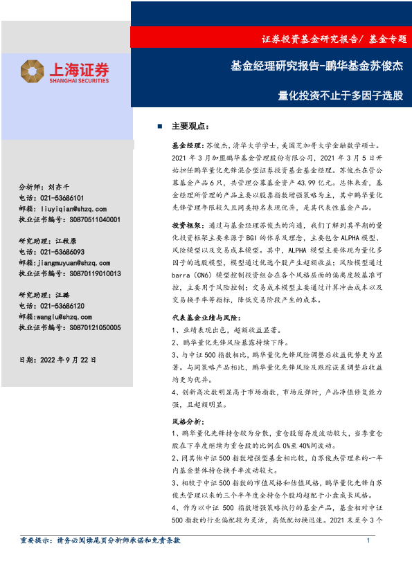 【上海证券】【20220922】基金专题:基金经理分析报告_鹏华基金苏俊杰,量化投资不止于多因子选股-23页