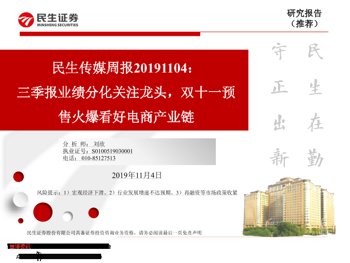 【民生证券】【20191104】民生传媒周报:三季报业绩分化关注龙头,双十一预售火爆看好电商产业链-23页
