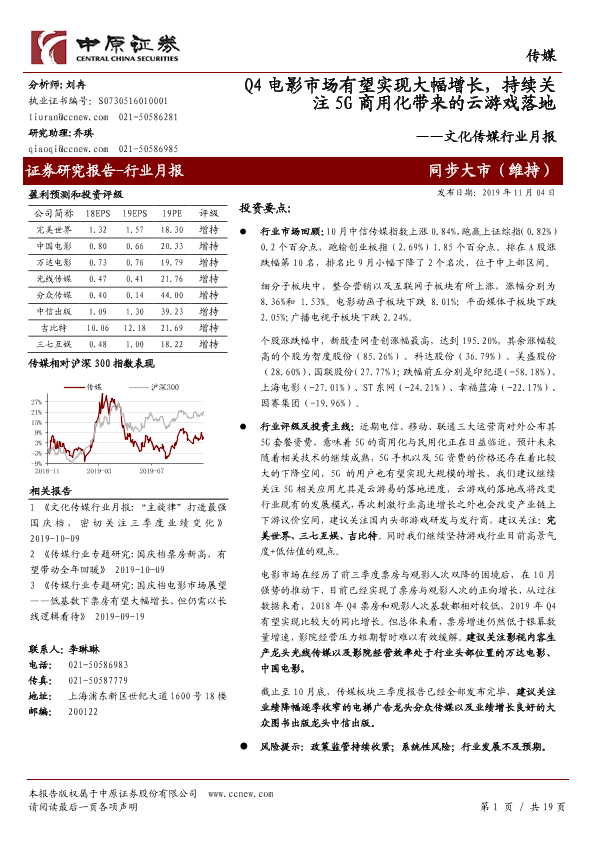【中原证券】【20191104】20191104-中原证券-文化传媒行业月报:Q4电影市场有望实现大幅增长,持续关注5G商用化带来的云游戏落地-19页