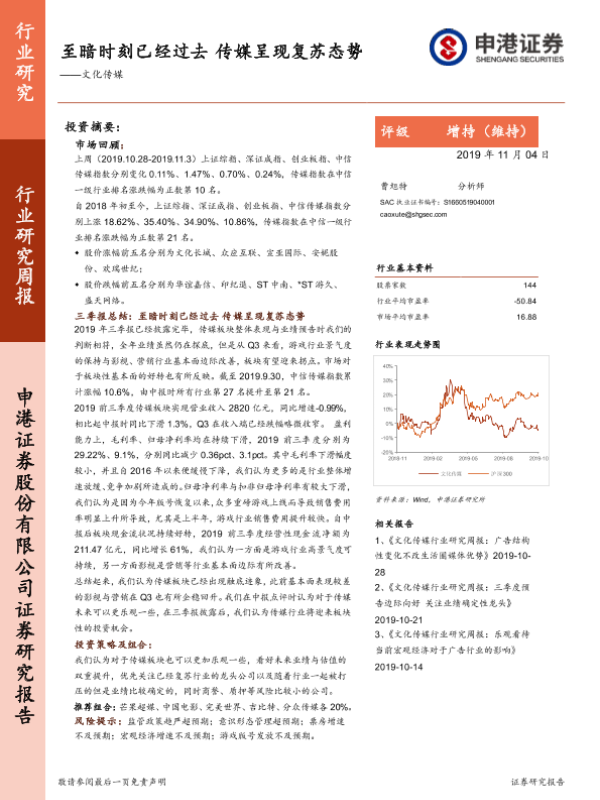 【申港证券】【20191104】20191104-申港证券-文化传媒行业研究周报:至暗时刻已经过去 传媒呈现复苏态势-33页