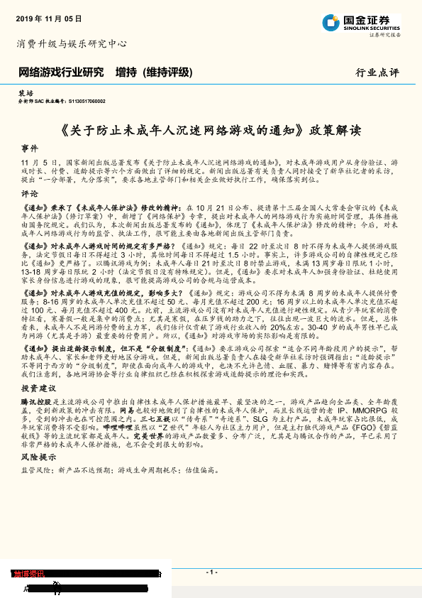 【国金证券】【20191105】20191105-国金证券-网络游戏行业研究:《关于防止未成年人沉迷网络游戏的通知》政策解读-7页
