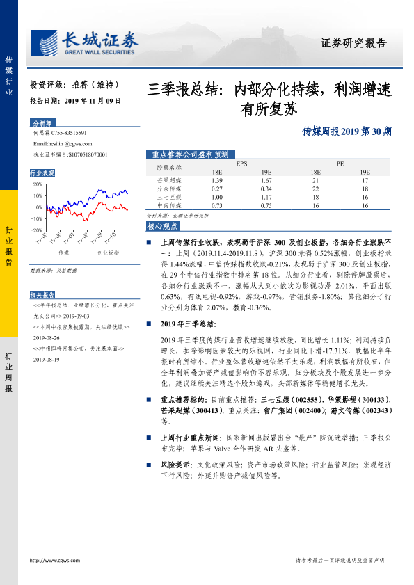 【长城证券】【20191109】20191109-长城证券-传媒周报2019第30期:三季报总结:内部分化持续,利润增速有所复苏-17页