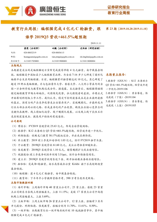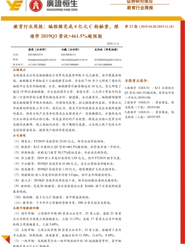 【广证恒生】【20191111】教育行业周报:编程猫完成4亿元C轮融资,跟谁学2019Q3营收+461.5%超预期-14页