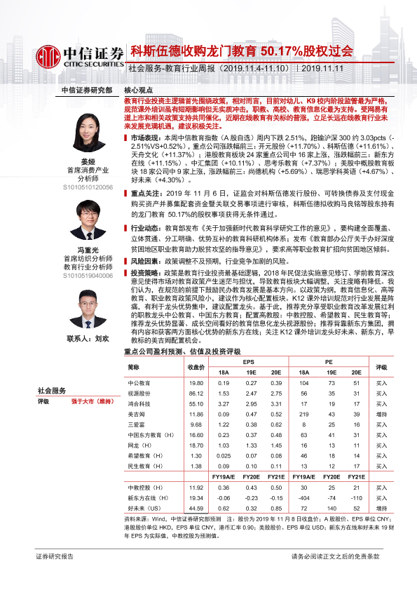 【中信证券】【20191111】社会服务-教育行业周报:科斯伍德收购龙门教育50.17%股权过会-11页
