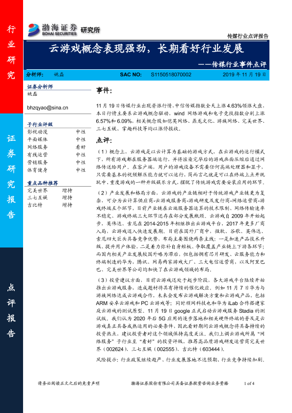 【渤海证券】【20191119】20191119-渤海证券-传媒行业事件点评:云游戏概念表现强劲,长期看好行业发展-4页