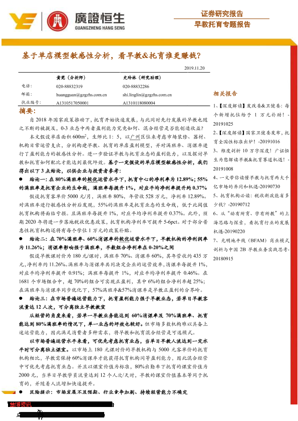 【广证恒生】【20191120】早教托育专题报告:基于单店模型敏感性分析,看早教&托育谁更赚钱?-19页