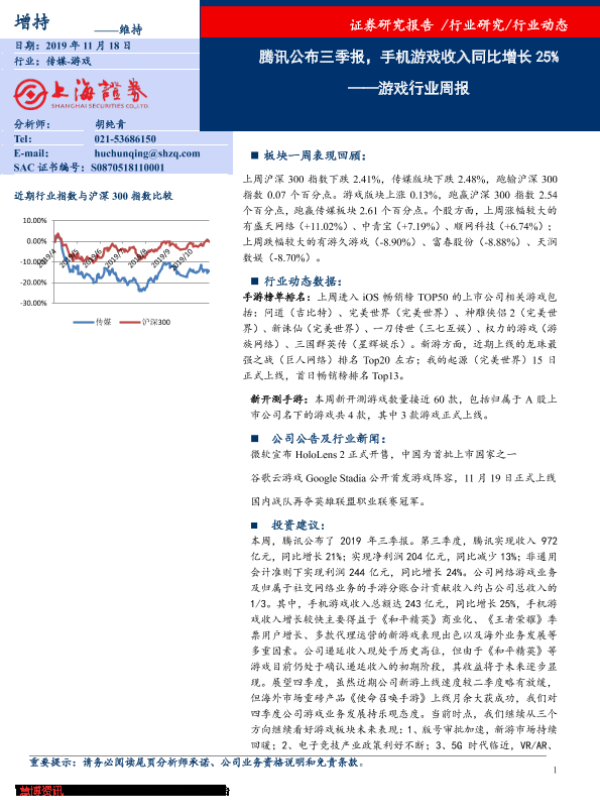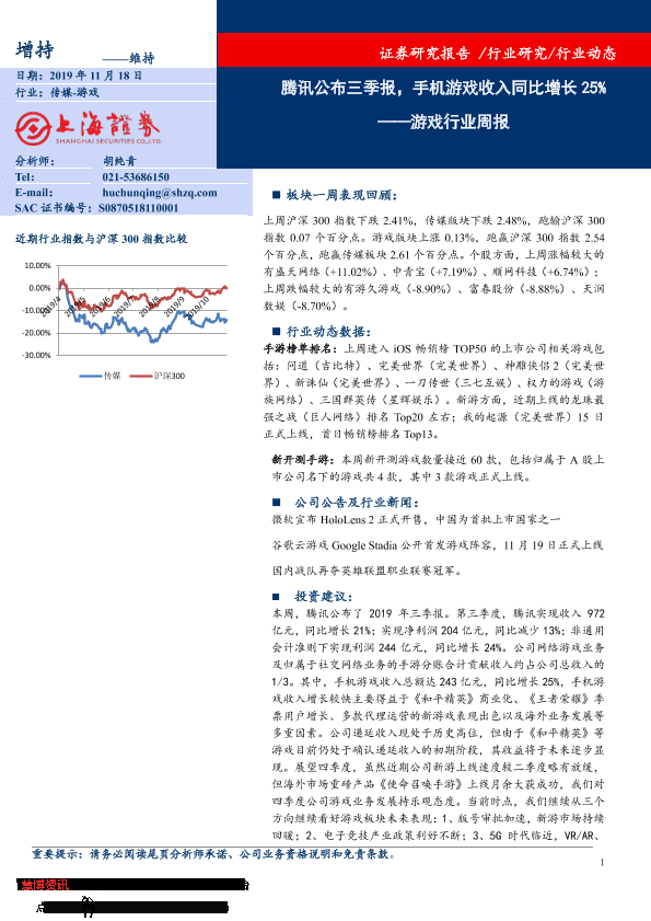 【上海证券】【20191118】20191118-上海证券-游戏行业周报:腾讯公布三季报,手机游戏收入同比增长25%-8页