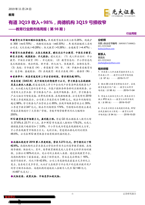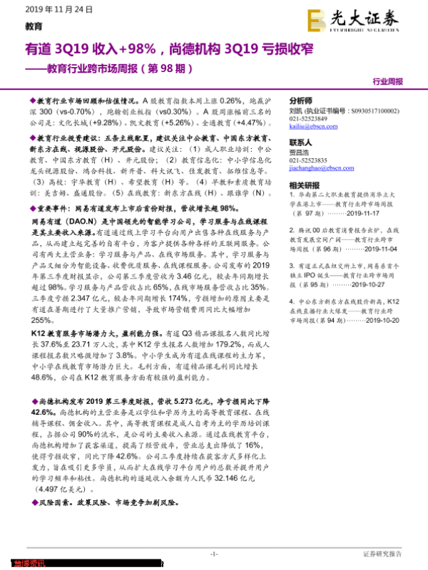 【光大证券】【20191124】教育行业跨市场周报(第98期):有道3Q19收入+98%,尚德机构3Q19亏损收窄-15页