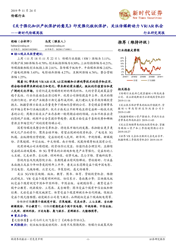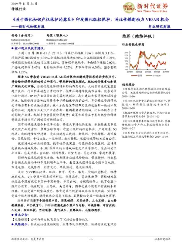 【新时代证券】【20191124】新时代传媒周报:《关于强化知识产权保护的意见》印发强化版权保护,关注传媒新动力VR AR机会-14页