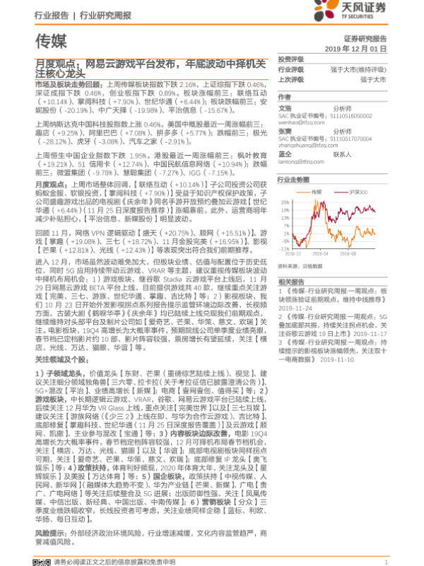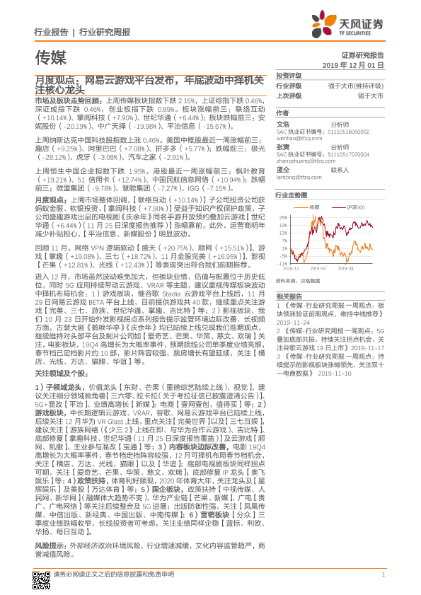 【天风证券】【20191201】20191201-天风证券-传媒行业研究周报:月度观点:网易云游戏平台发布,年底波动中择机关注核心龙头-25页