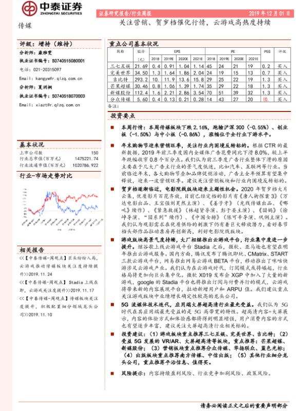 【中泰证券】【20191201】传媒行业周报:关注营销、贺岁档催化行情,云游戏高热度持续-11页